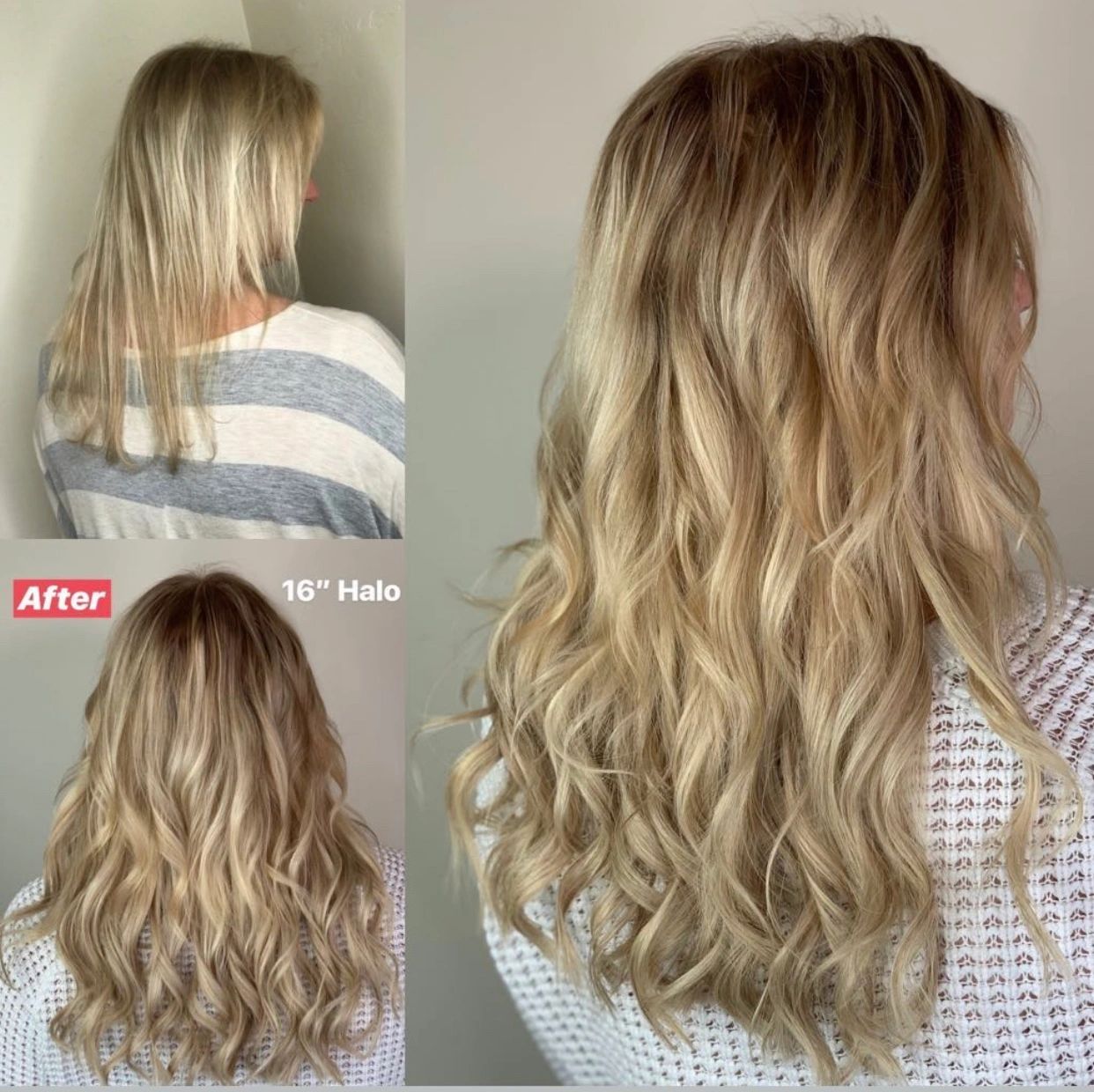 You will need 2 appointments. (30 MINUTES EACH). The First one is to try on the Halo Samples and Place your order. (HALF THE PRICE IS DUE AT THIS TIME). The Second appointment is to Pick up your Halo. I will show you how to install it and I will customize it for you and style/curl it. I pre-wash them when they arrive and deep condition them and allow them to air dry overnight. This ensures that the natural wave will be most beautiful and have the most volume. Unwashed Halos are more straight and smooth. Add $75 to above quoted price to have your Halo Rooted. (Darker Roots). Halos are great for special events and brides. Also for those who do not want to commit to a more permanent option (sewn in extensions). Halos are removable. They are great for a very active lifestyle, just remove it, exercise, then put it back on. It takes about 30 seconds to install. These are addictive, most ladies own more than one! They last about 1 year if worn daily. Much longer if only worn a few times a week. Check out their Website Link Below. Scroll down for my Favorite HaloCouture instructional videos. Their instagram is @halocoutureExtensions. You can also get a Halo to wear UNDER your row of sewn in extensions. The options are endless! . Once I can order your Halo I can have it ready for you in 3-5 days.