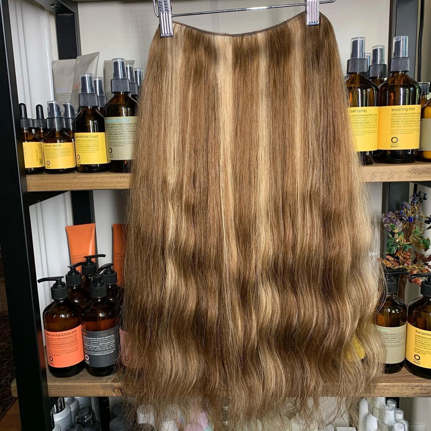 Curious about Halos? Want to come in to try them on? Fill out my New Client Form or Text me Photos of your hair from the back and the front. Be sure the lighting represents your hair perfectly so that I can be sure the color of the halo blends best with your hair. Your halo can be worn alone or with your sewn in extensions to give more thickness and length. If you are taking a break from your hand tied sewn in extensions this is the perfect time to pick up a halo. *** No Retainer Needed until after you try the Halos on and decide to order one.